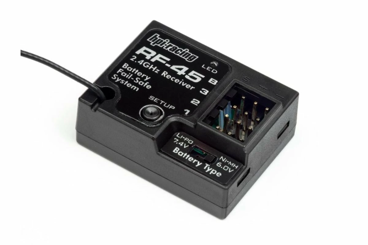 Using Frequency-Hopping Spread Spectrum (FHSS) digital 2.4GHz radio technology, the RF-45 works with any TF-40 or TF-45 radio via a simple and quick binding procedure to give you a secure, reliable connection at all times. Should the radio link ever fail for some reason, the radio will instantly switch the throttle channel to its failsafe position, which you can set to full brake for a nitro vehicle. HPI RTR vehicles already have the failsafe position set from the factory.