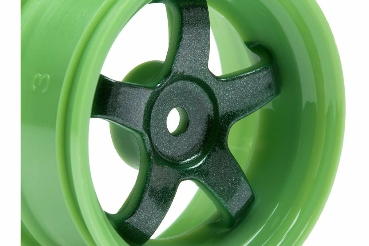 Aย 3mm offsetย version of the Green Work Meister S1 Wheel as fitted to 1/10th scale replicas of Vaughn Gitten Jr Signature 1969 Ford Mustang RTR-X.
