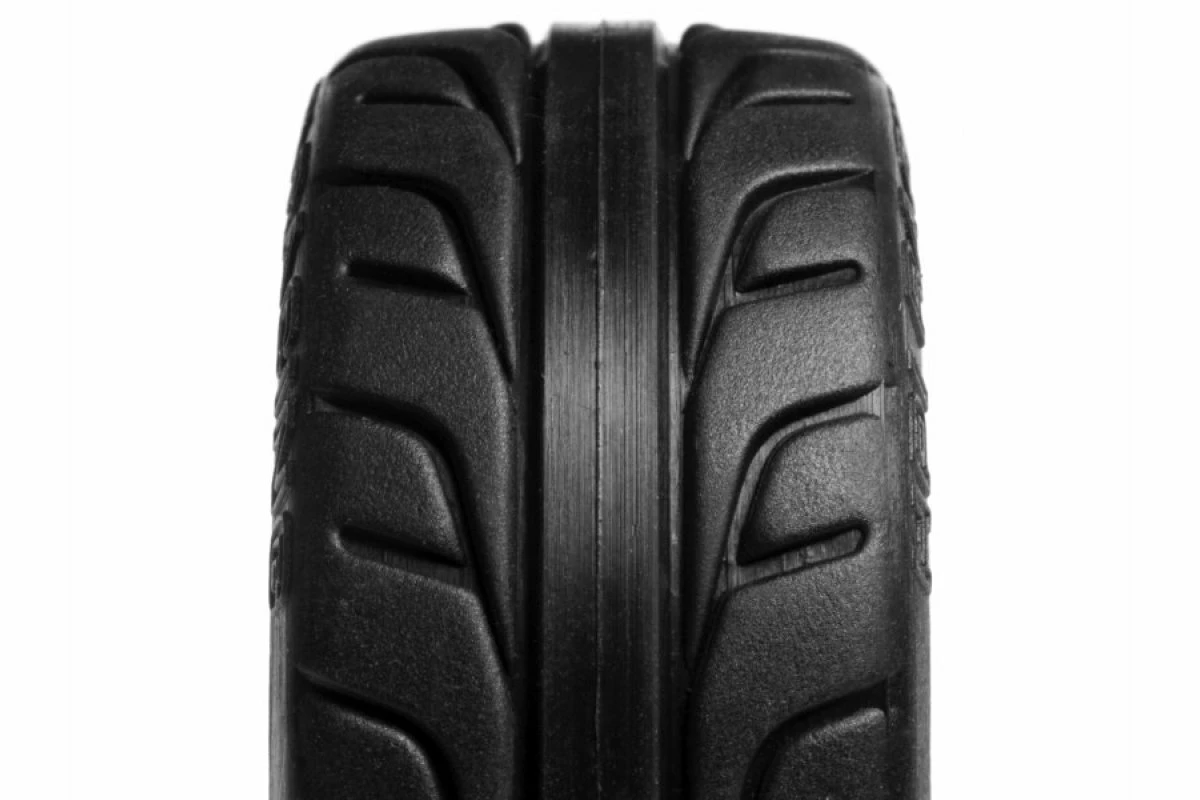 A treaded rubber tyre for easy street driving and long life.